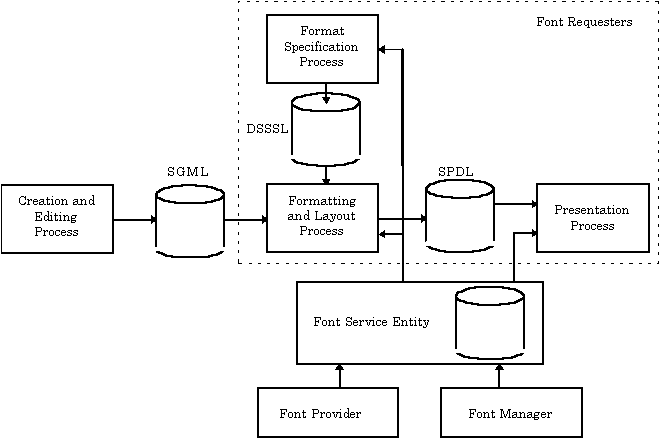 Figure 4-2 shows the relationship between the font service entity and the ISO/IEC JTC1/SC18 document processing architecture.